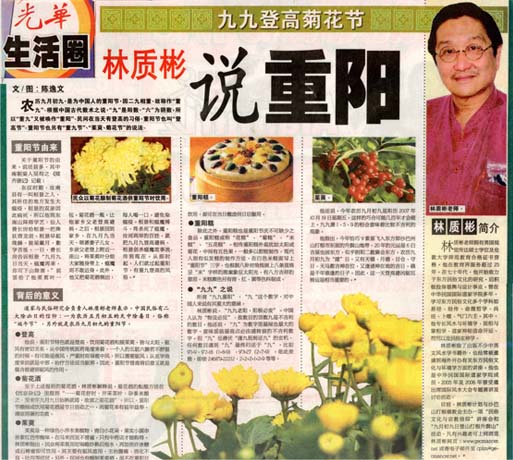 Double 9 Festival 重九节 also known as the Chrysanthemum festival 菊花节, the Yang Festival 重阳節; In I-Ching, 9 is a yang number; Yang refers to maximum positive forces, which also means the Sun. As such, the 9th day of 9th lunar month becomes Double 9, which is too strong in yang forces (Positive forces). According to traditional Chinese spiritual concept, this is a potentially inauspicious date. In order to avoid inauspicious occurrence, it is customary to climb a high mountain, drink Chrysanthemum wine and wear zhuyu 茱萸 plant. Both chrysanthemum and zhuyu are considered to have cleansing qualities and cure illnesses. Some people also have the custom of visiting the graves of their ancestors to pay respects.